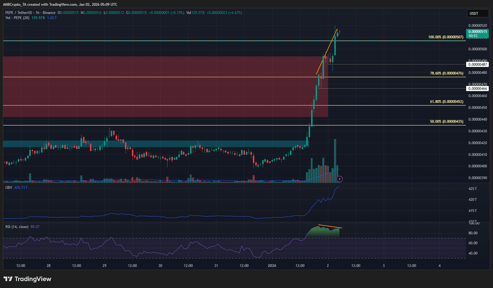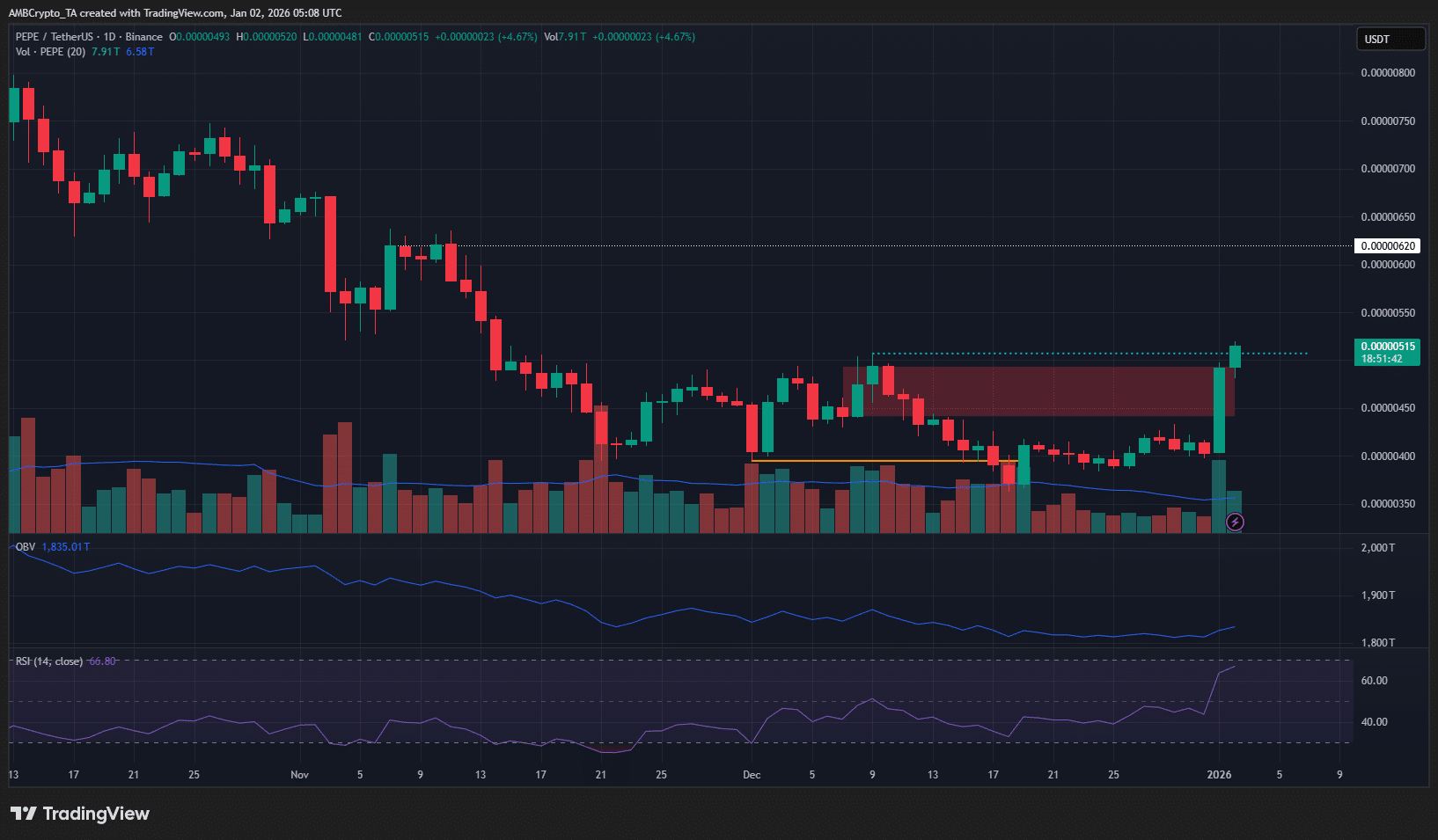 Another attempt on Thursday, 01 January, had more success. At the time of writing, PEPE had a strong short-term bullish bias.
