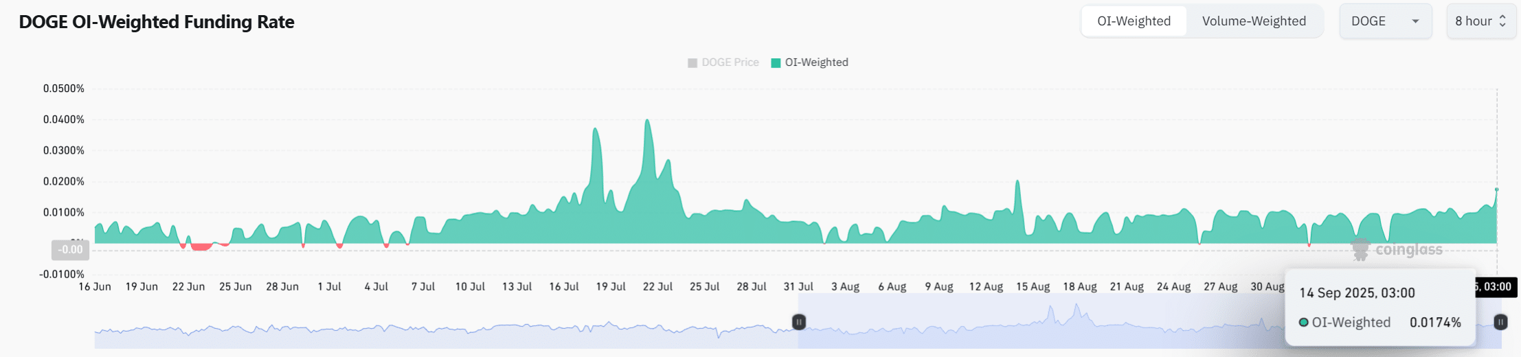 The OI-Weighted Funding Rate climbed steadily, hitting 0.0174% at press time and signaling dominance from long traders.