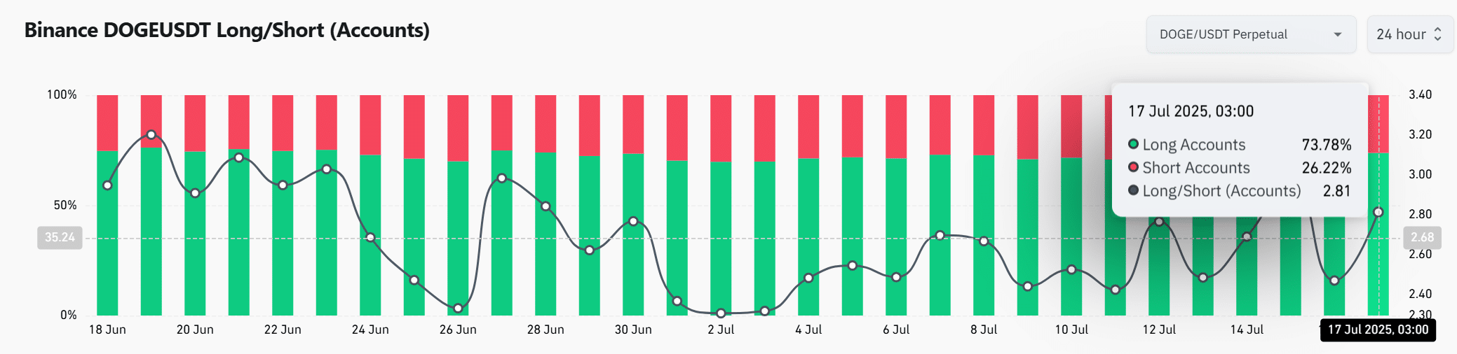 Long positions continue to dominate the DOGEUSDT market on Binance, with 73.78% of traders currently betting on an upside. The Long/Short Ratio has surged to 2.81, indicating heavy bullish bias.