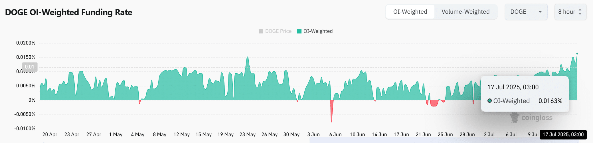 Funding Rates for DOGE have flipped notably positive, with the OI-Weighted Funding Rate reaching 0.0163% as of press time.