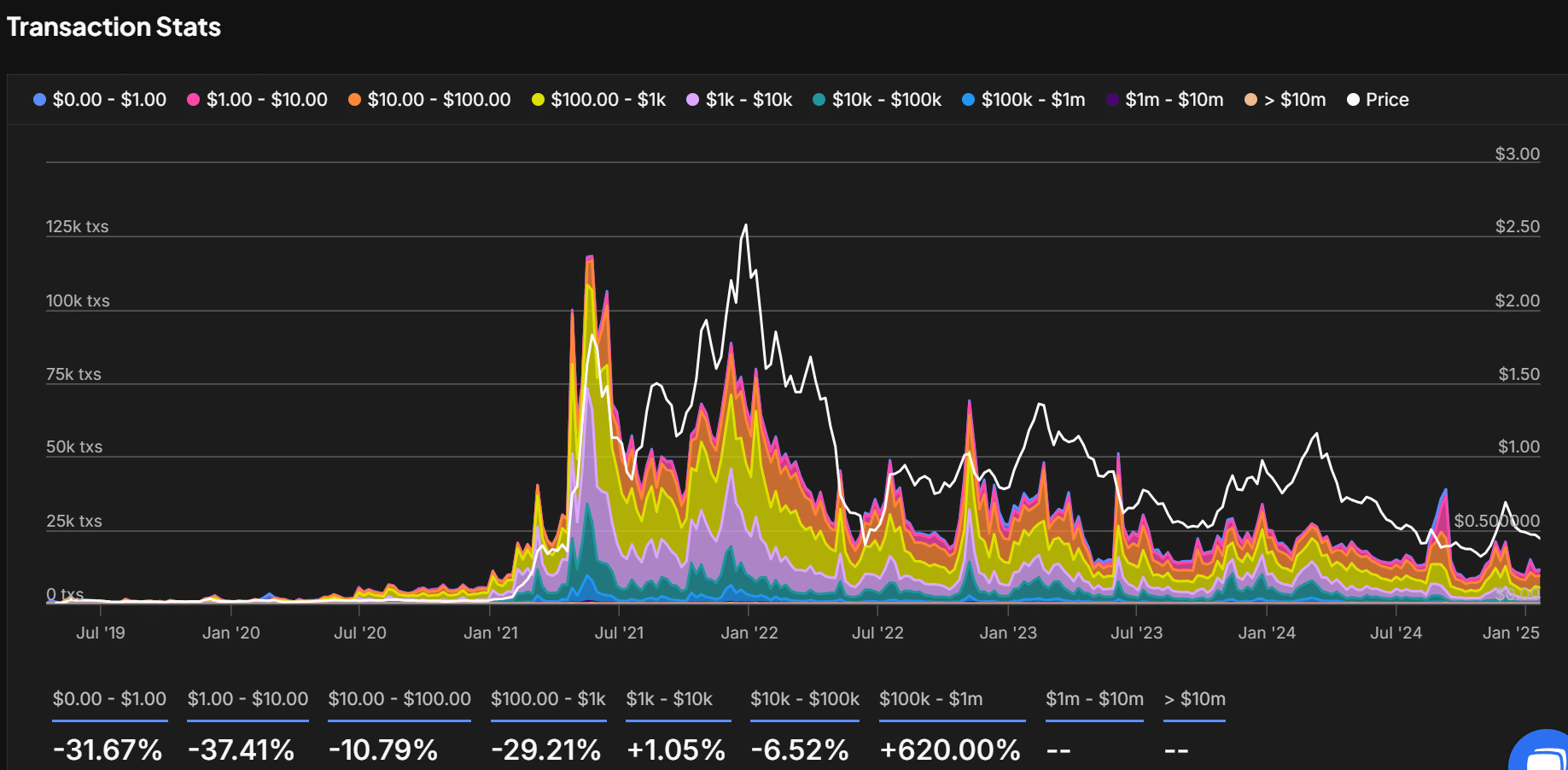 Polygon transactions between $100K and $1M surged 620%, indicating increased institutional movement. However, transactions under $100 have dropped sharply, showing that retail interest is fading.