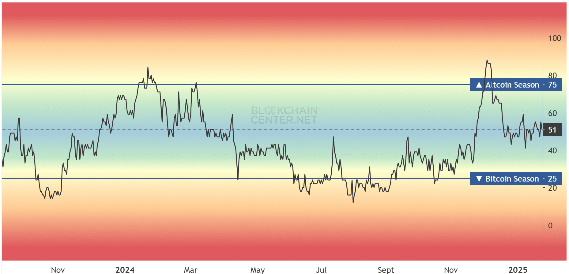 Since late December 2024, the index has fluctuated near 50, exposing most altcoins to range or dumping. However, select coins like Solana [SOL] have recorded modest gains over the same period.