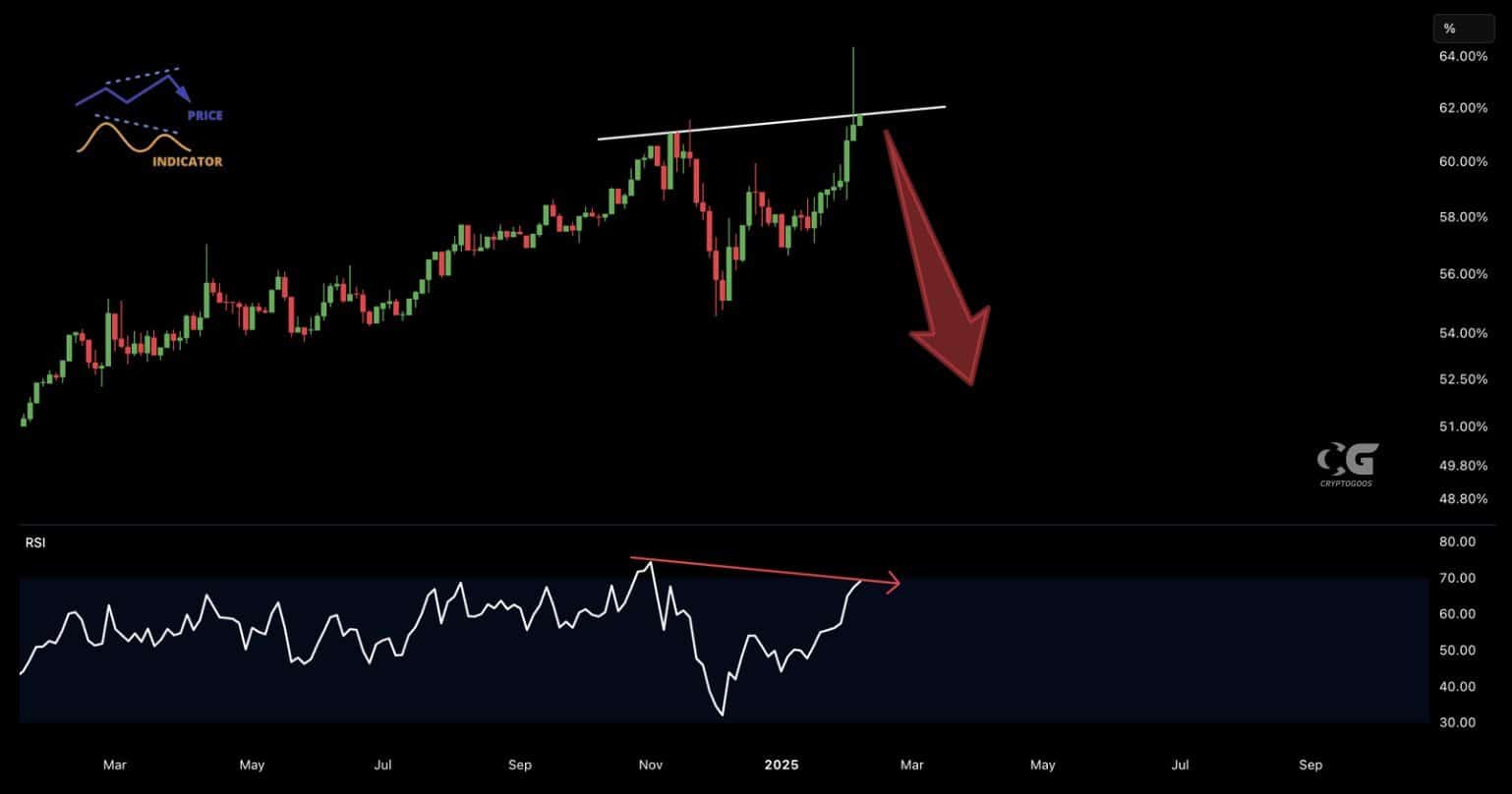 This is after Bitcoin dominance saw a bearish divergence — the price peak and a lower peak on the RSI.