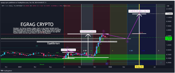 Egrag Crypto, a well-known crypto analyst on the social media platform X, recently shared an optimistic price prediction for XRP. According to the analyst, technical analysis of the XRP price on the weekly timeframe suggests that XRP is on track to reach a price target of $15 by May 5, 2025.