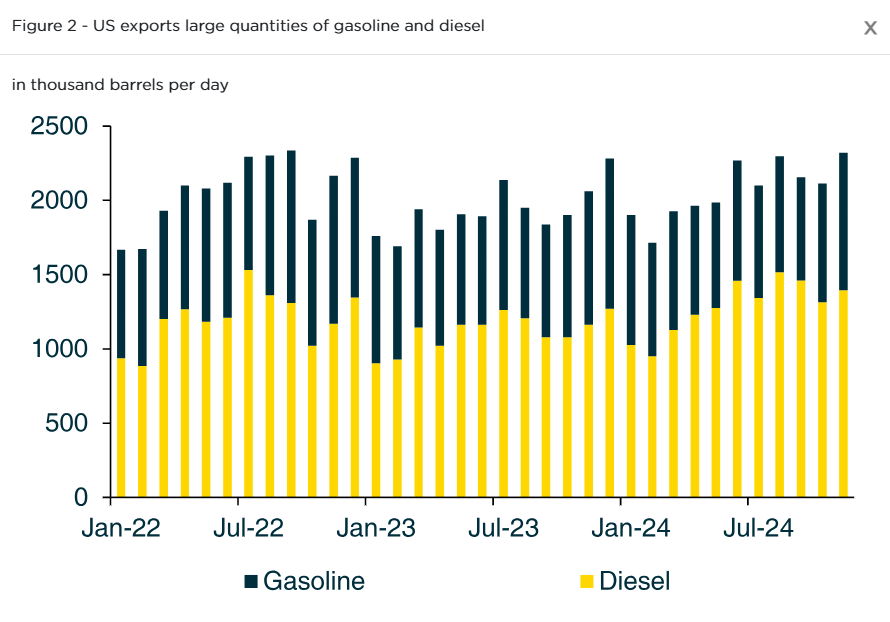 The US could have also reduced its oil product exports. In the first eleven months of last year, the US exported an average of just under 3.2 million barrels of refined petroleum products per day.