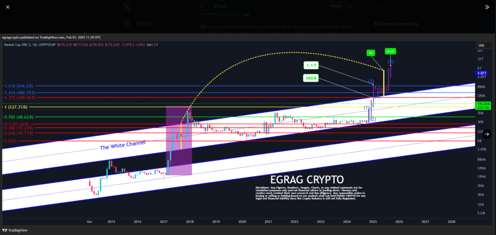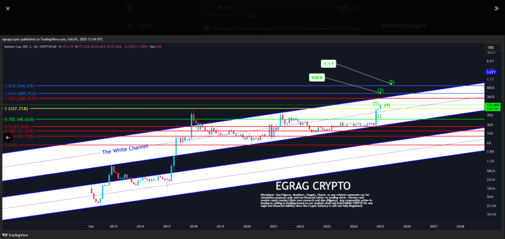 Egrag Crypto predicts that XRP will grow significantly, possibly reaching a market value of $300 billion or even $1 trillion. Despite some legal issues, XRP’s strong foundation and increasing attention from institutions suggest that its price could rise significantly, possibly reaching $20 or even $70.