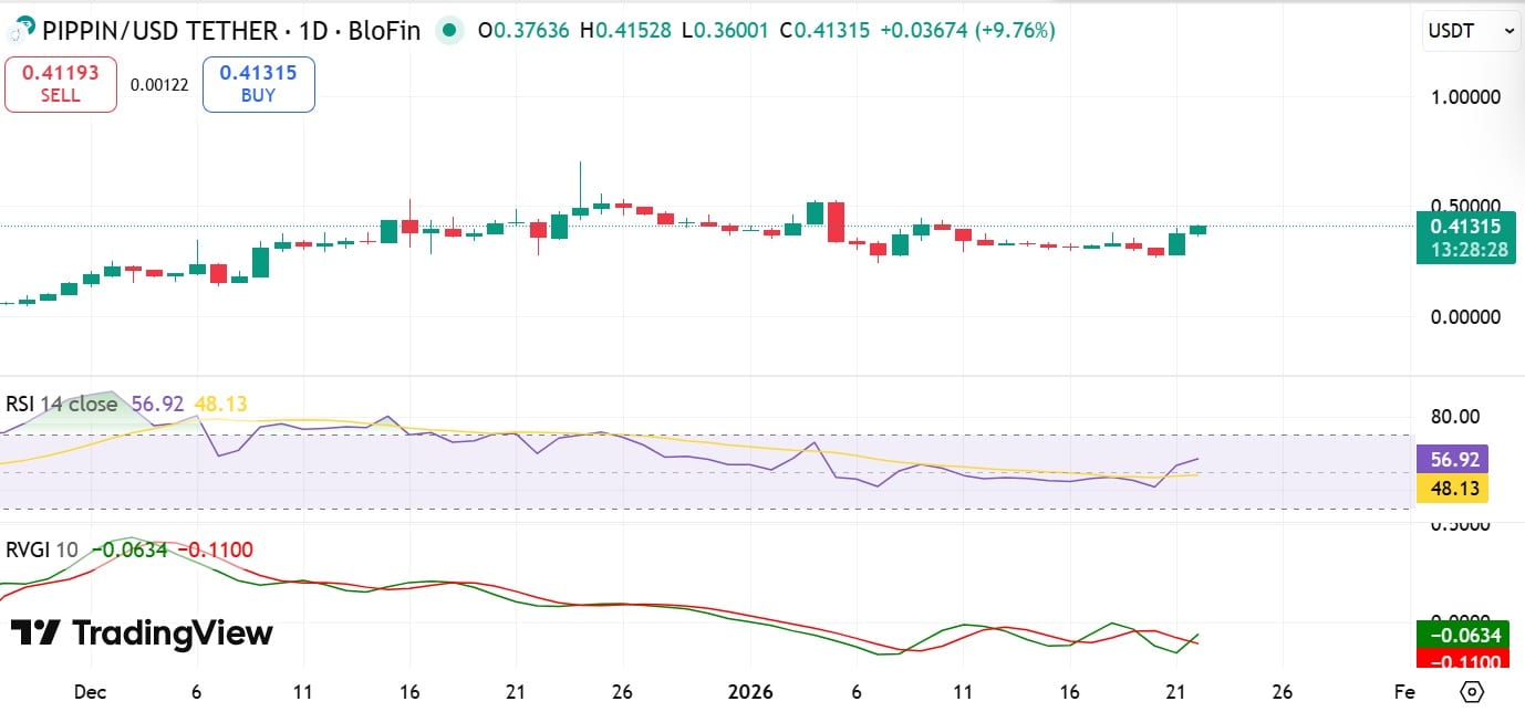 As of this writing, PIPPIN traded at $0.412, up 27.57% on the daily charts. Over the same period, its volume jumped 21% to $56.5 million, while its market cap rose 25% to $388 million.