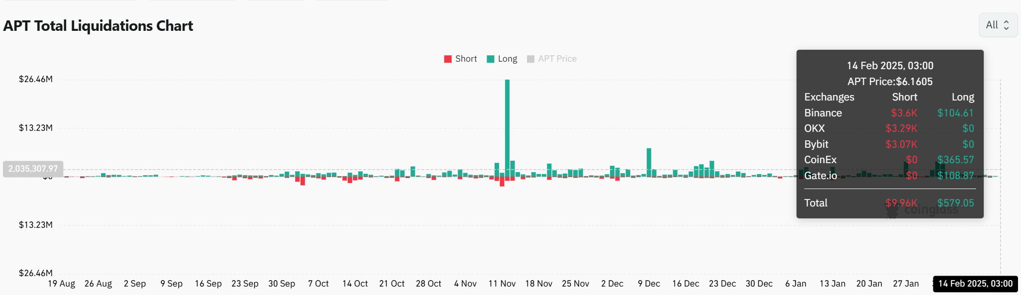 APT has witnessed significant liquidations recently, totaling $9.96 million. Most of these liquidations came from short positions on exchanges, where short-sellers were caught off guard by the price increase.