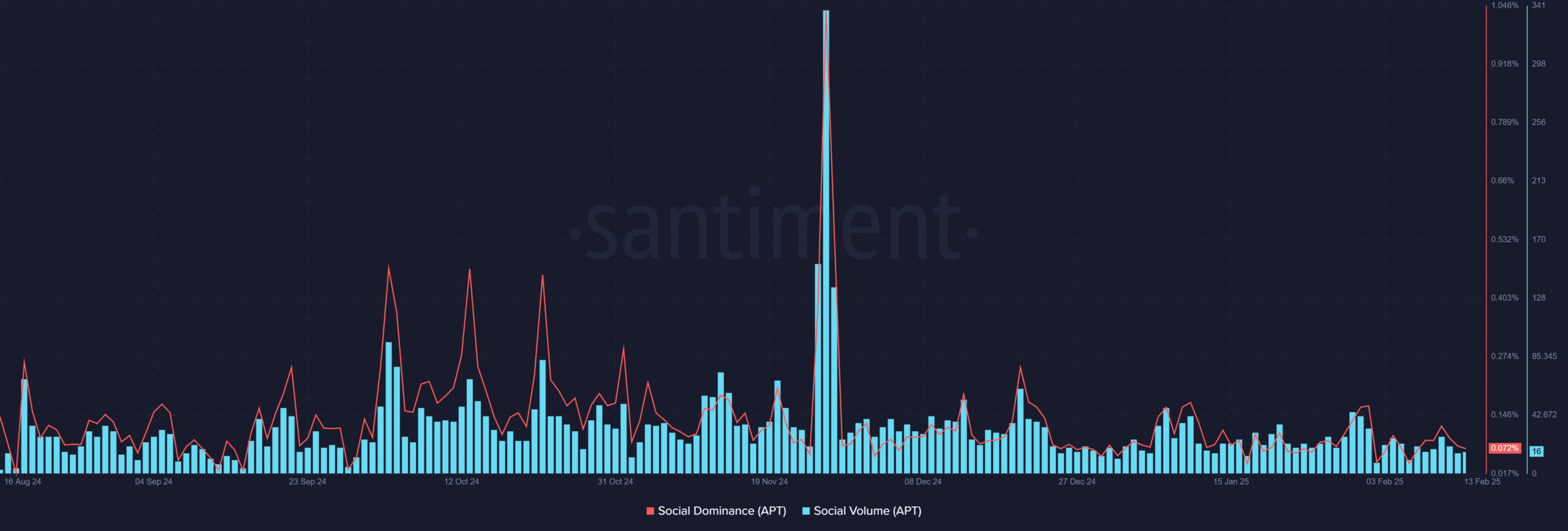 Aptos’ Social Dominance and Volume have been declining, raising concerns about the sustainability of its price movement. Social Volume recently peaked at just 16 mentions, while social dominance is down to a mere 0.072%.