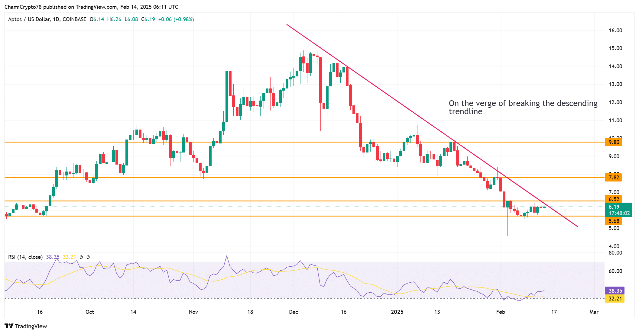 Aptos has seen notable price fluctuations over the last several months. After reaching its high of $9.80, the price has faced substantial resistance and is currently hovering around $6.19. If APT can break through this resistance, it may rally toward $7.82 and $9.80.