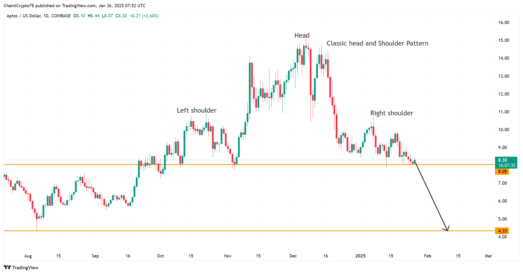 The Aptos price chart reveals a classic head-and-shoulders pattern, signaling potential downside. The neckline at $8.05 represented a critical support level, with a breach likely confirming a decline toward $4.30.