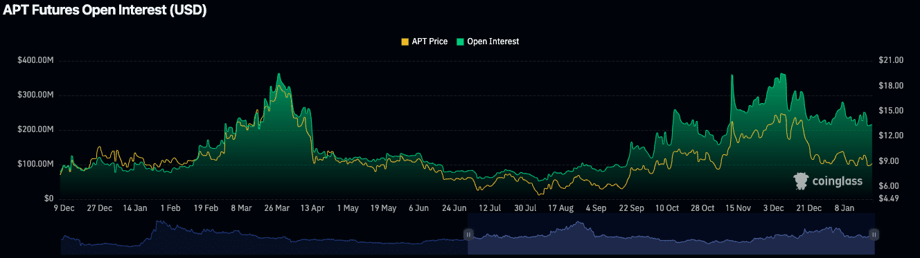 According to Coinglass data, APT’s Open Interest (OI) was $224.99 million at press time, reflecting an 8.89% increase over the past 24 hours.