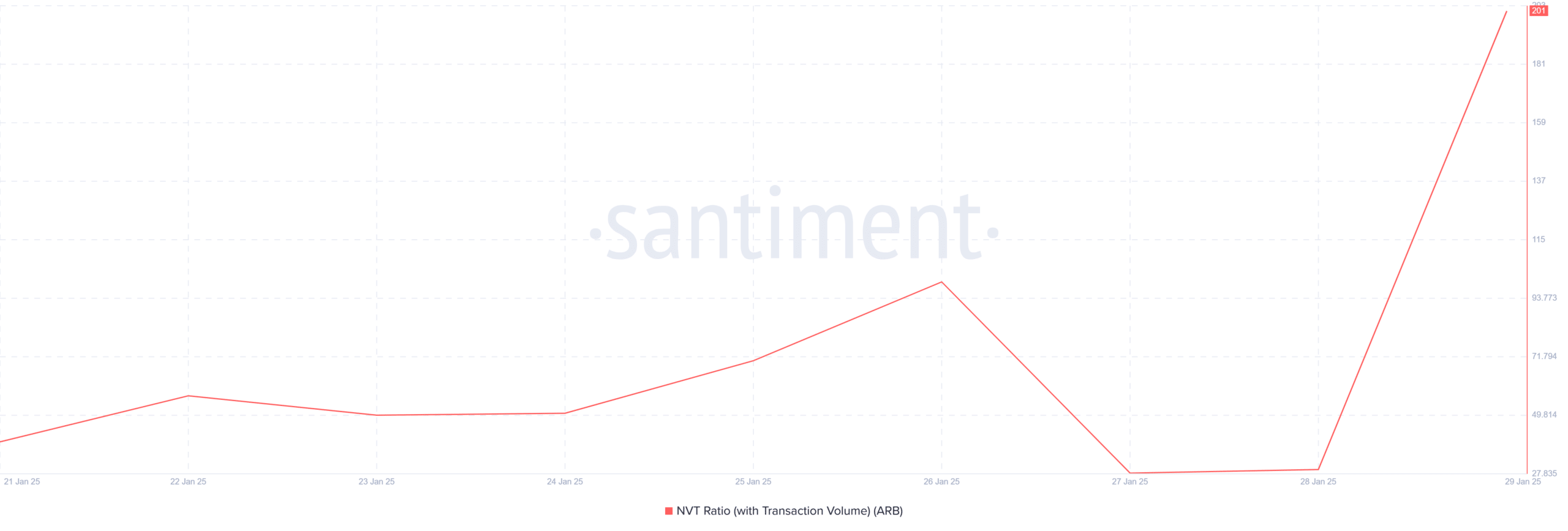 Looking further, Arbitrum’s active users and adoption rate have experienced a sharp decline. The NVT Ratio (with transaction volume) surged to 201 from a low of 29.46.