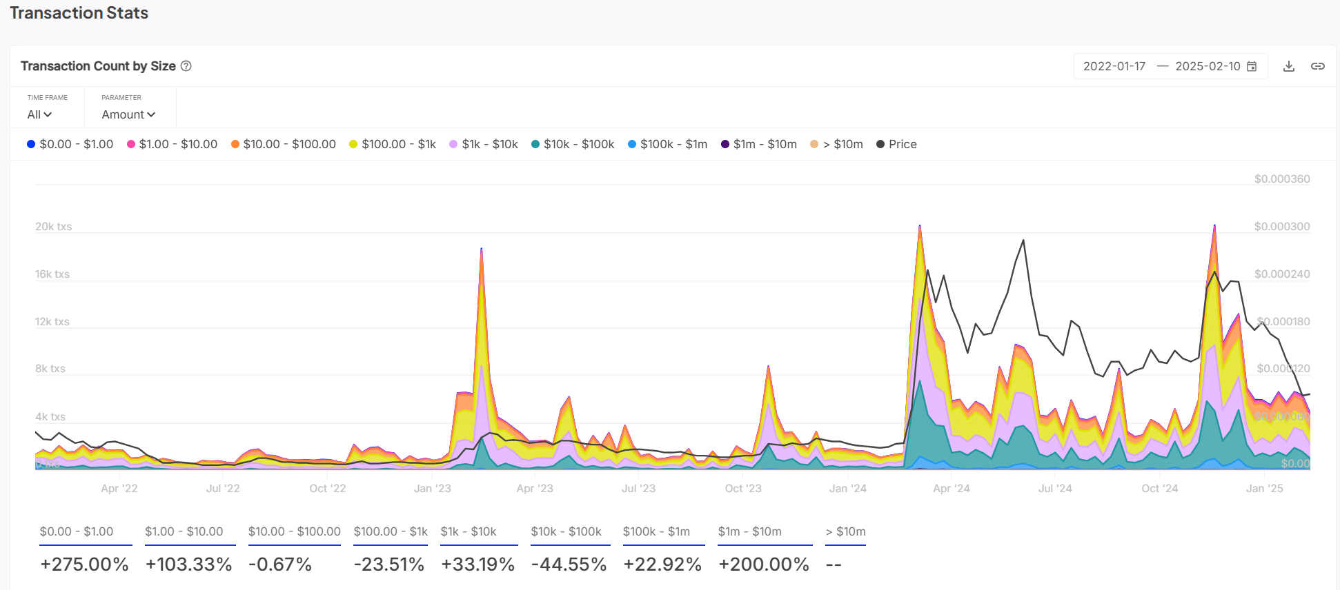 The memecoin registered a surge in smaller transactions, with the $0.00 – $1.00 category increasing by 275%. This is a clear sign that retail traders have been entering the market and accumulating FLOKI.
