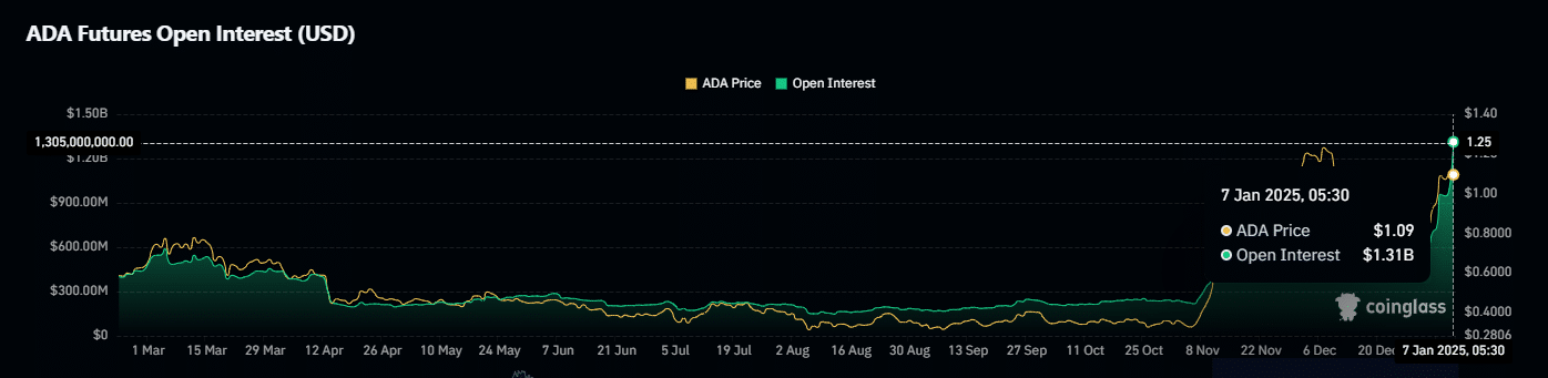 This rally also sent Open Interest (OI) soaring by 11%, hitting an impressive $1.31 billion. To put that into perspective, ADA’s press time OI was even higher than when it hit its yearly high of $1.24 during the “Trump pump.”
