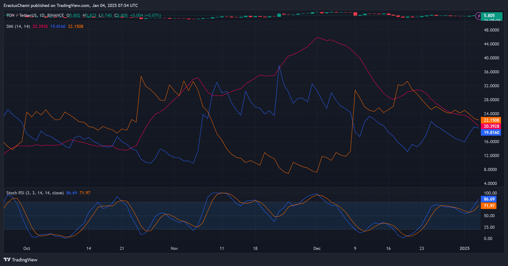 The altcoin’s technical indicators reinforced the bullish outlook for TON. The DMI highlighted strong trend strength, with the -DI at 22.15 and the +DI at 19.82, signaling that sellers are still slightly active, but buyers have been gaining dominance.