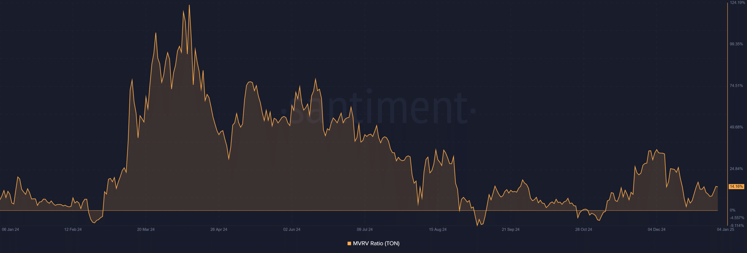 At press time, the MVRV ratio stood at 14.16%, reflecting moderate profitability among holders without signaling an overbought market. This level suggested that TON still has room for further upward movement, before triggering significant sell-offs.