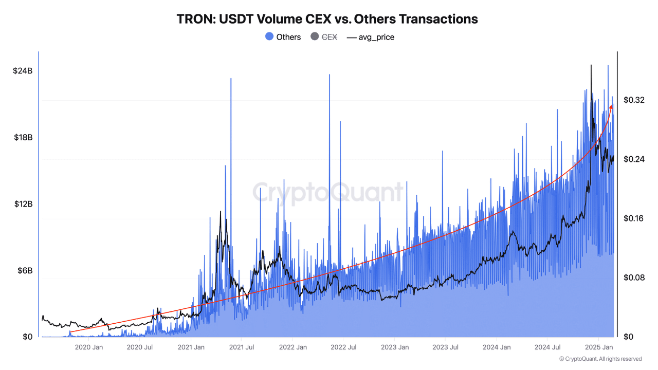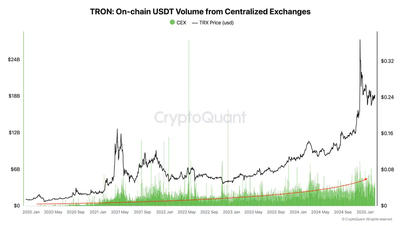 An analysis of USDT volume on TRON-based centralized exchanges (CEXs) has skyrocketed as well. In 2020, for instance, daily volumes ranged from $50 million to $500 million. At the time of writing, however, they had exceeded $4 billion.