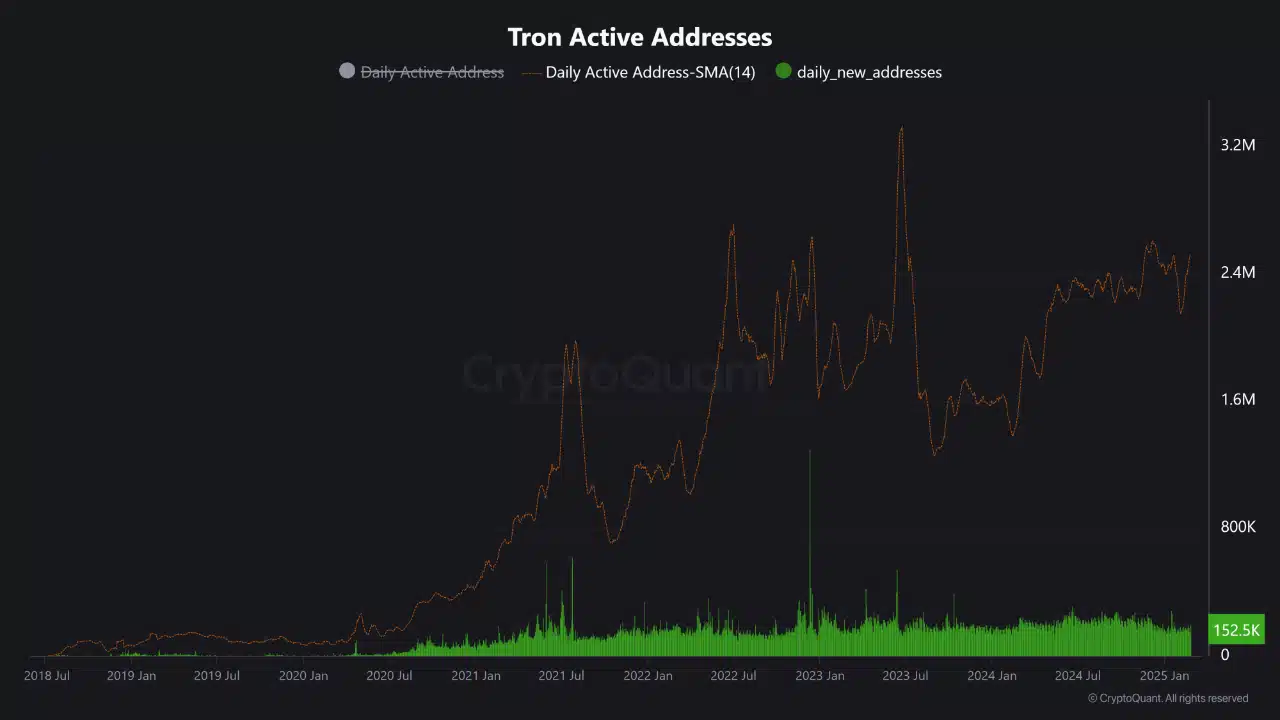 Simultaneously, new addresses have continued to emerge, reinforcing TRON’s expanding user base.