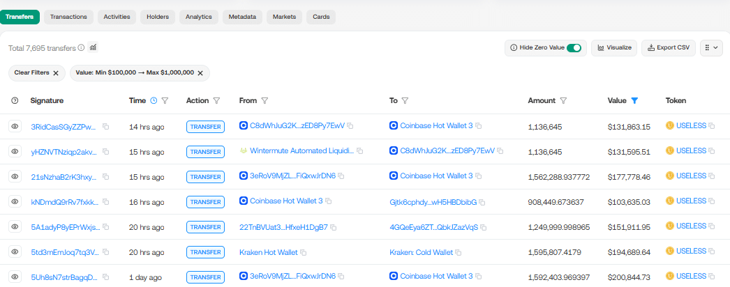Wintermute moved more than $131K worth of the tokens, while Coinbase moved over $500K in capital. In total, more than $600K in USELESS was ready for selling.