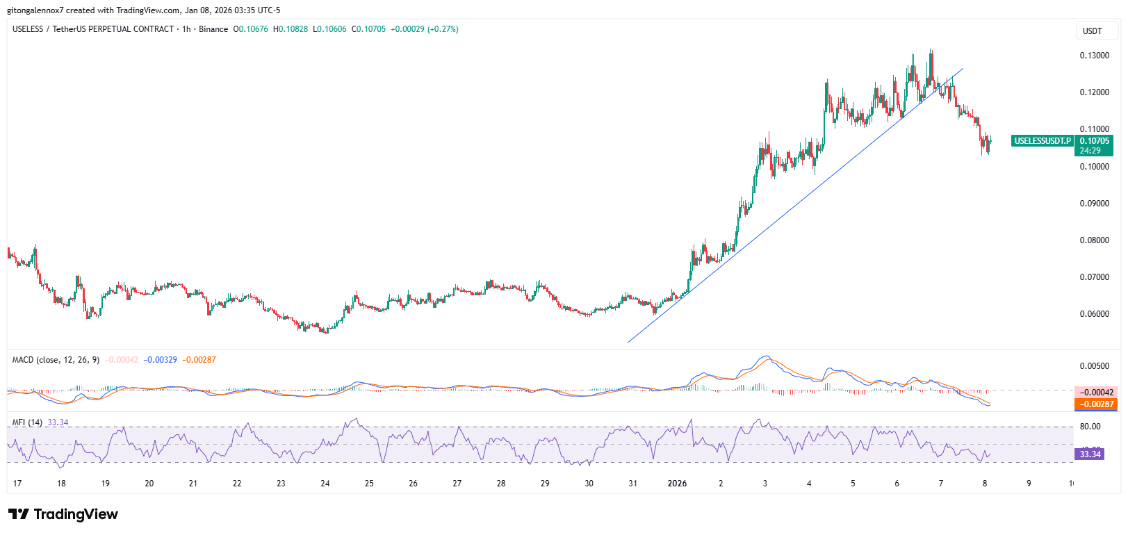 The price action charts showed that USELESS broke an ascending trendline support that had been in place since the start of this month. The first week of January 2026 saw the memecoin reach $0.12, but bulls were unable to break past this level.