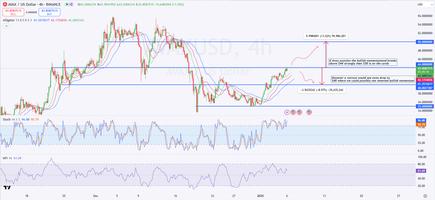 - Key resistance near $44 must be cleared for AVAX to reach the short term $50 target.