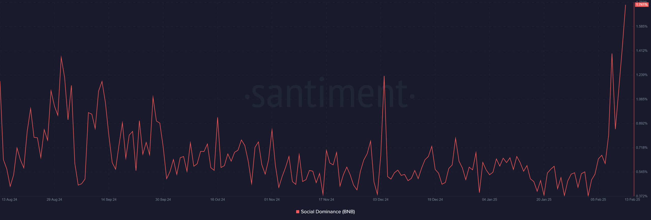 - Rising social dominance, bullish indicators, and derivatives data signaled continued upward momentum for BNB.