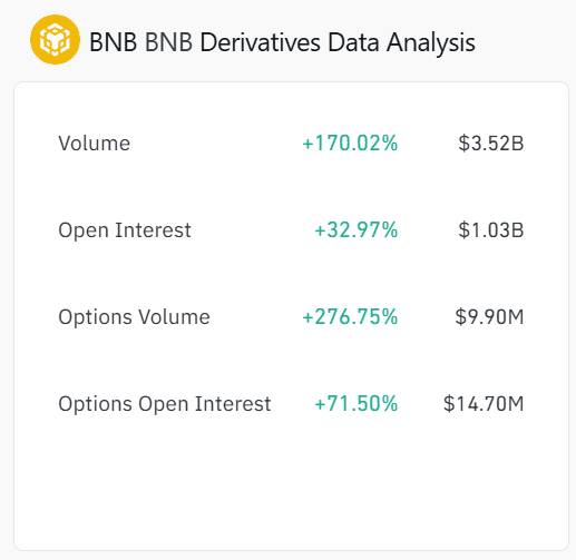 Additionally, Options Volume has jumped by 276.75%, reflecting heightened market activity. These numbers indicate that traders are positioning for more upward movement, which could further propel $BNB’s price.