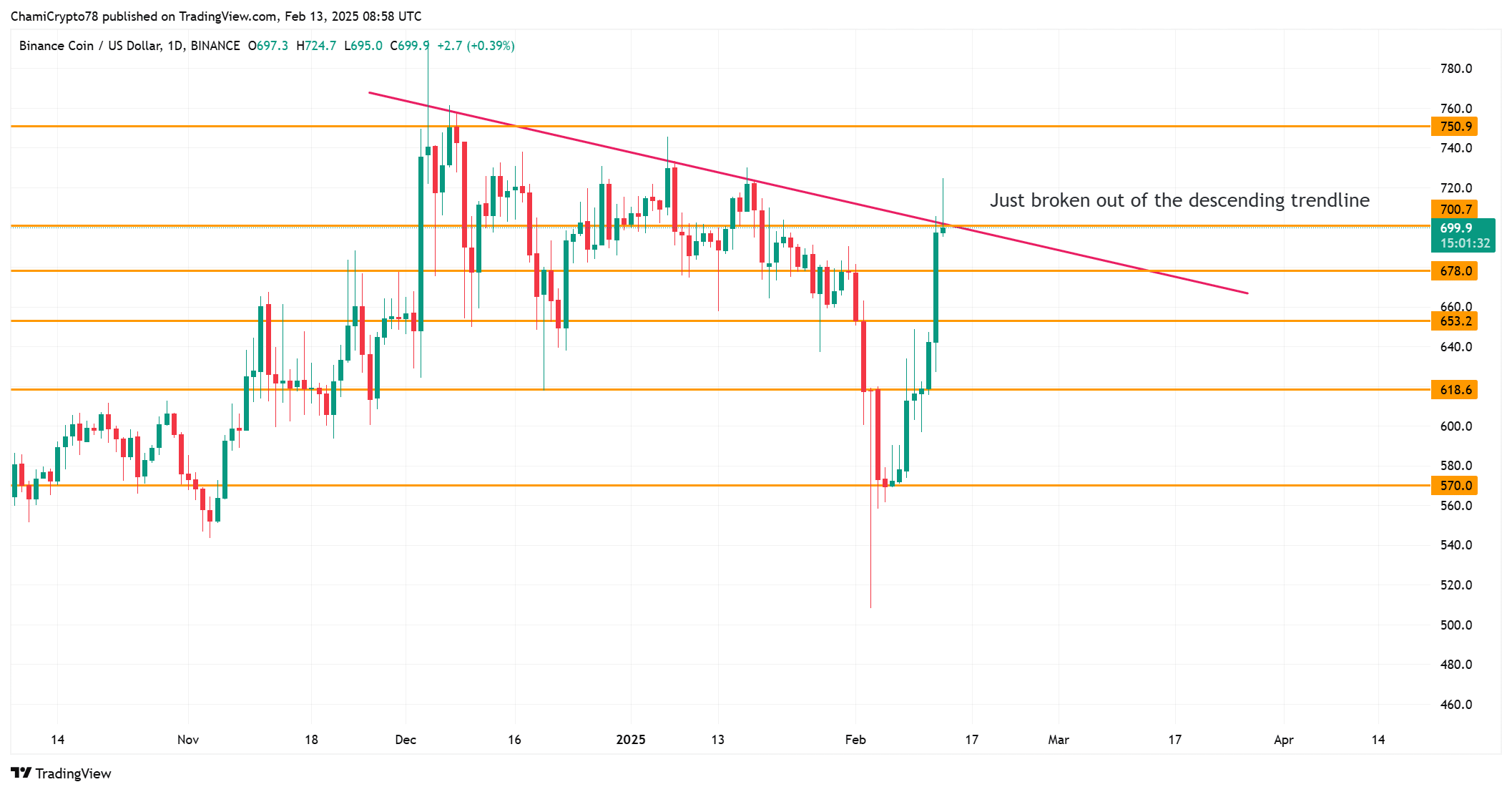 - BNB has broken through key resistance levels, positioning itself to target $720.