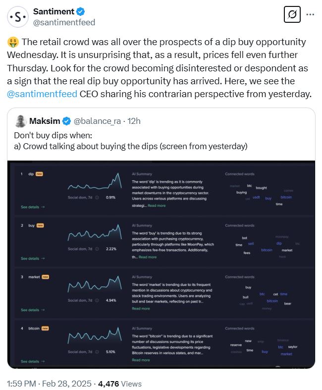Social media mentions of crypto dip buying have rocketed to their highest level since last July amid a crypto market rout that recently sent Bitcoin under $80,000.