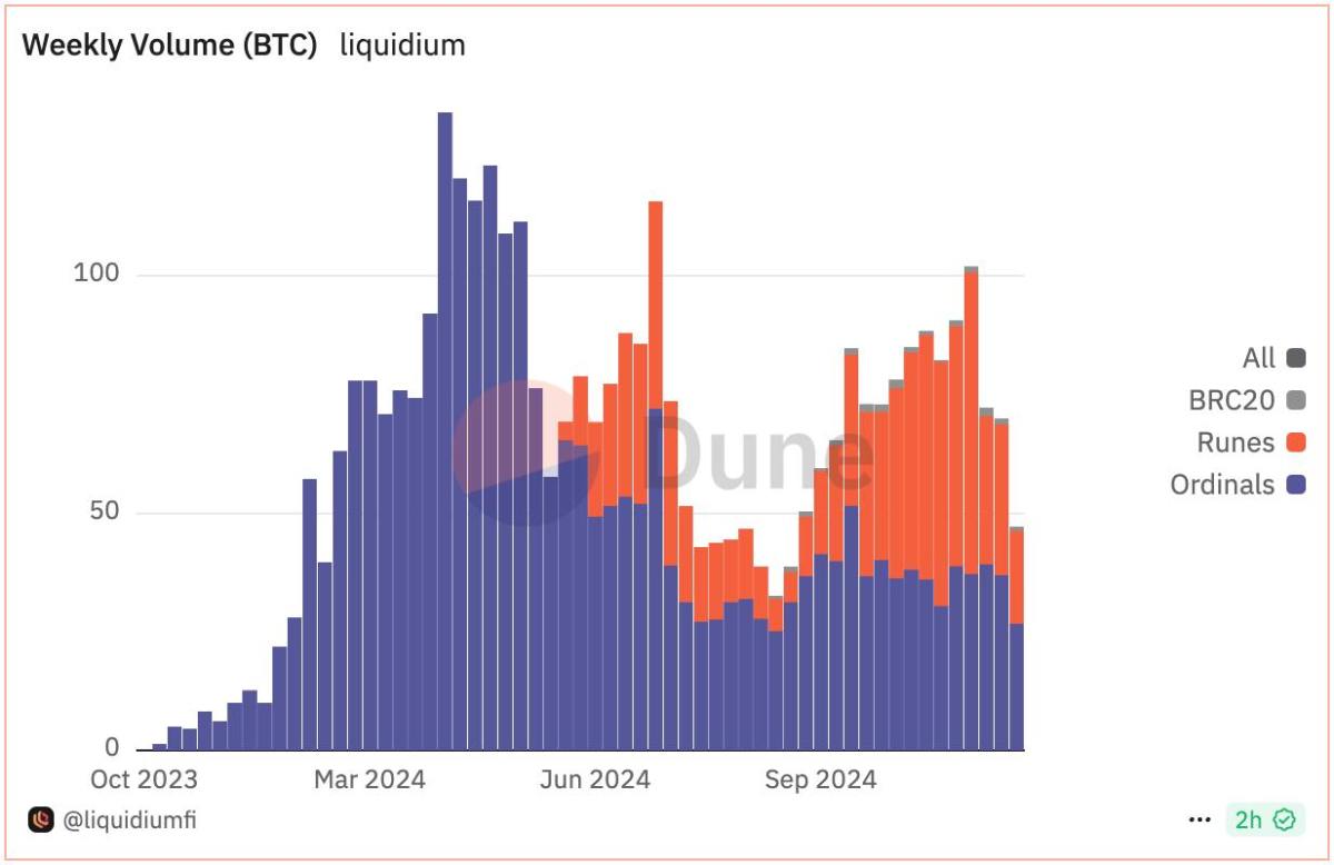 The volume of loans on Liquidium has consistently increased over the past year, with Runes now comprising the majority of activity on the platform.