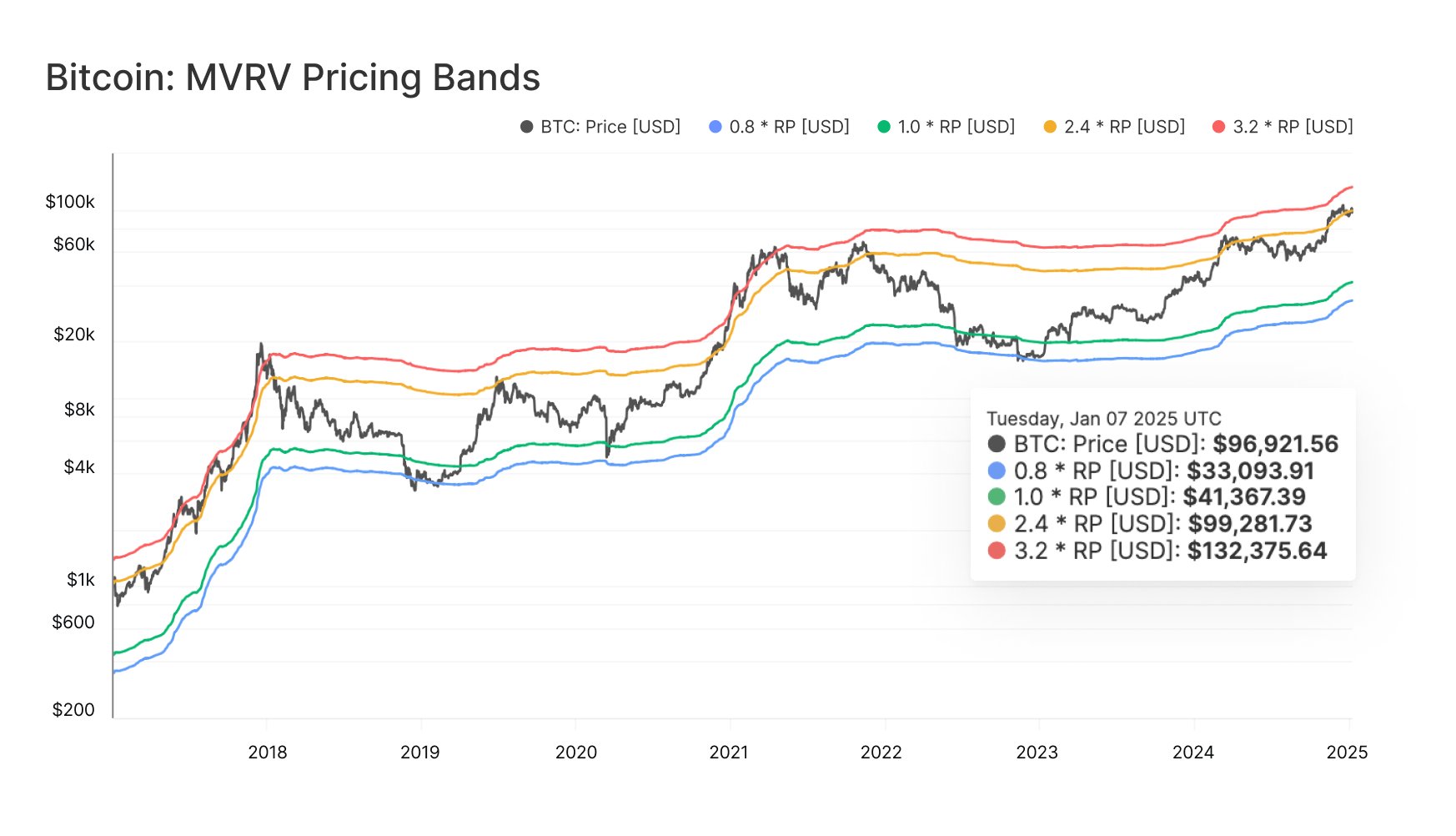 The MVRV Pricing Bands aim to capture this relationship. It defines certain price levels for the cryptocurrency that correspond to important levels in the MVRV Ratio.
