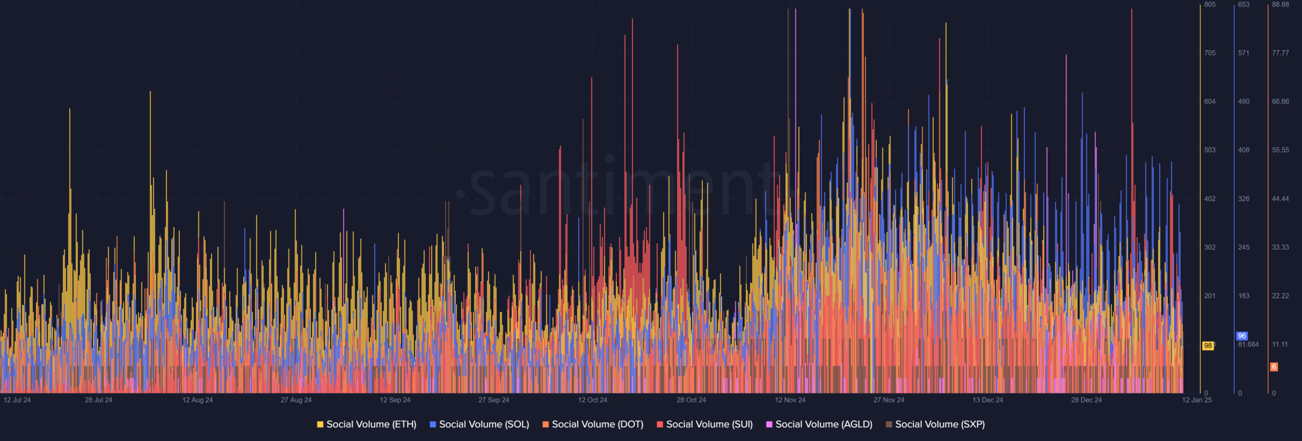 Social volume data echoed this sentiment. As can be seen on the chart, while Ethereum [ETH] maintained high engagement levels, SUI and Solana have been rapidly closing the gap, buoyed by network developments and community-driven hype. Altcoins like DOT and AGLD also saw spikes in social volume, pointing to their rising popularity in trading discussions.