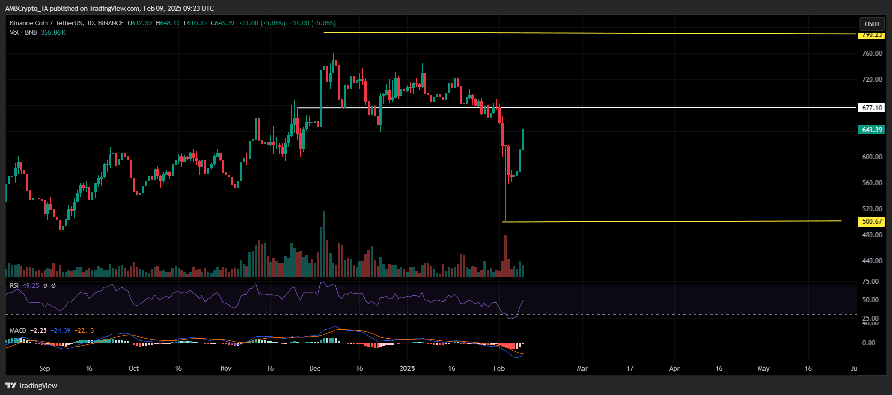 Given this setup, a $650 target doesn’t seem far off, but overheating could stall the rally. If momentum runs too hot, BNB may need another “dip” before making a real push toward $700.