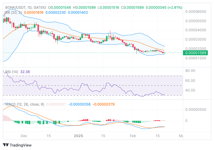 The Bollinger Bands showed low volatility, with BONK trading near the middle band at $0.00001589. If the price moves above $0.00001816, it could confirm a trend reversal.