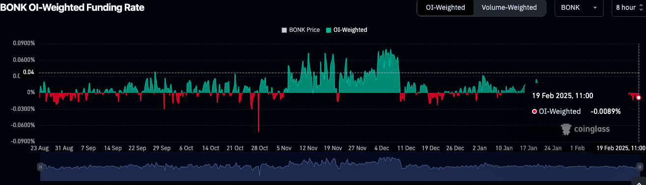 Market data showed mixed sentiment among traders. According to Coinglass, BONK’s trading volume has increased by 4.66% to $25.29 million, while Open Interest was up 4.30% to $9.86 million.