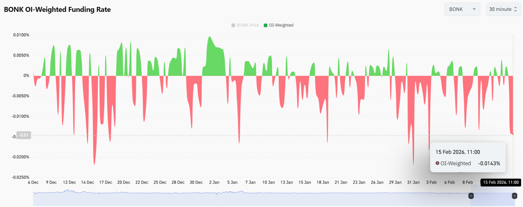 The OI-Weighted Funding printed -0.0143% at the time of writing, reflecting persistent negative bias in derivatives markets. Shorts now pay longs to maintain positions.