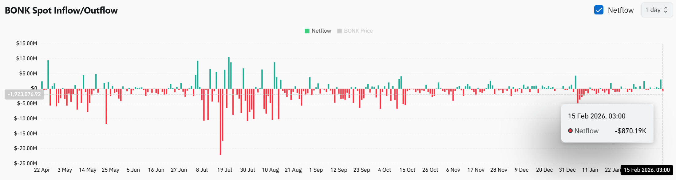 Throughout recent weeks, red bars have dominated the inflow/outflow chart. Even during price weakness, traders removed BONK from centralized platforms.