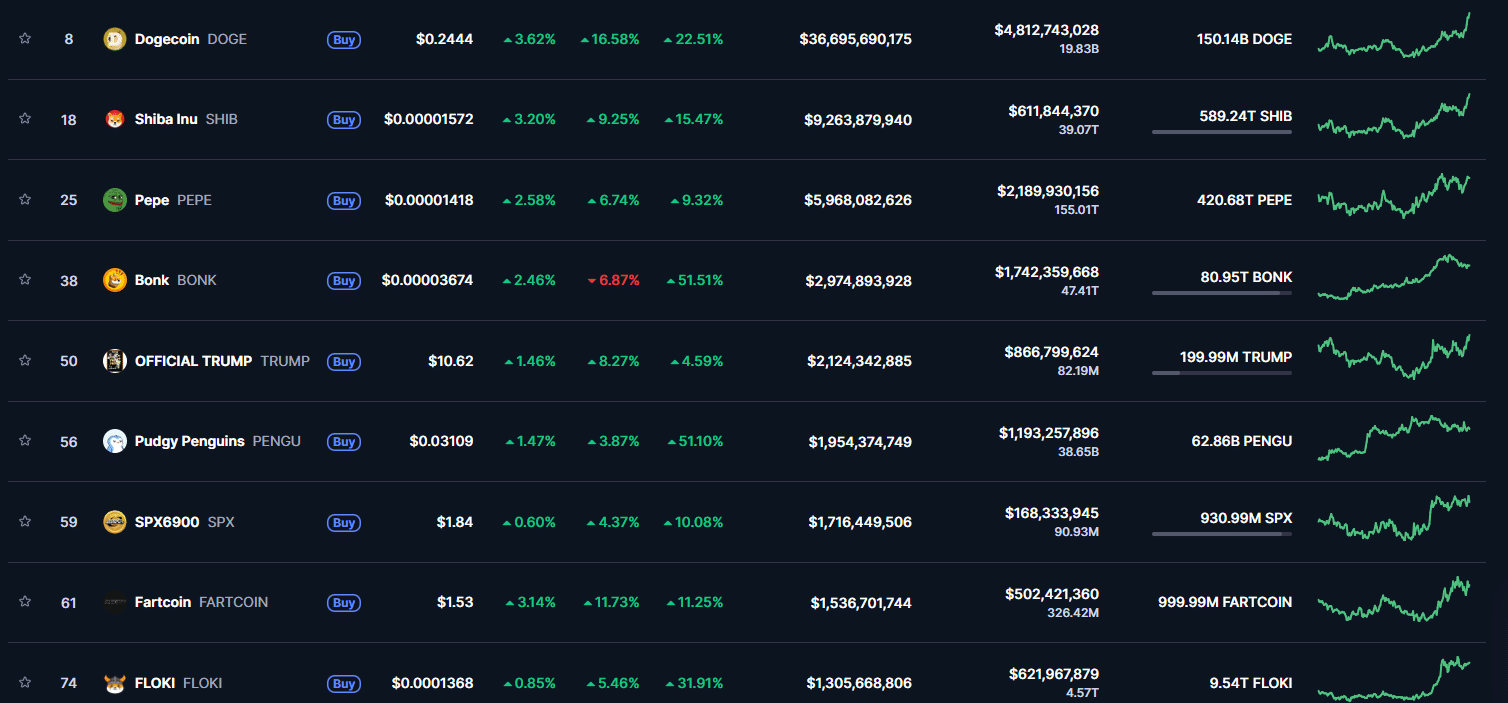 Even newer entrants like Pudgy Penguins [PENGU] and Official Trump [TRUMP] tokens posted over 50% and 4.5% weekly gains respectively, showing renewed speculative interest.
