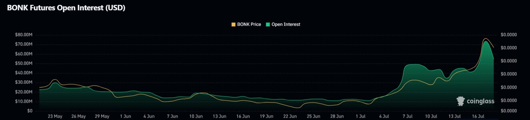 The chart showed a steep climb in both price and open interest beginning around the 4th of July, showing renewed risk appetite among traders.