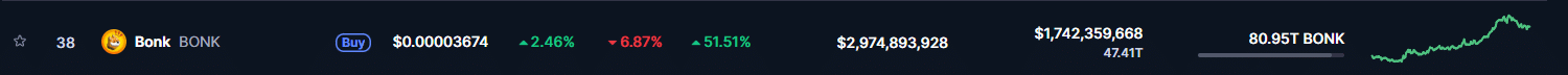 Despite BONK’s daily dip, its chart reflects a steep and sustained uptrend, suggesting it still commands the narrative.