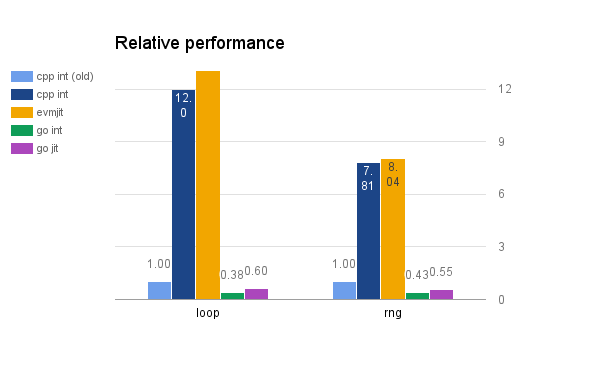 Greg Colvin spent the last months speeding up the C++ implementation of the EVM interpreter. He harvested what he calls the low-hanging fruits (he worked for Oracle on the Java interpreter before…).   The most important improvements so far have been replacing 256-bit calculations with 64-bit calculations for gas metering, and making sure that no more metering calculations are done for each VM operation than necessary.  These and other changes resulted in the following results for Paweł Bylica’s nascent benchmark suite. The following chart shows the speedup relative to the old cpp ethereum interpreter (cpp int (old)).