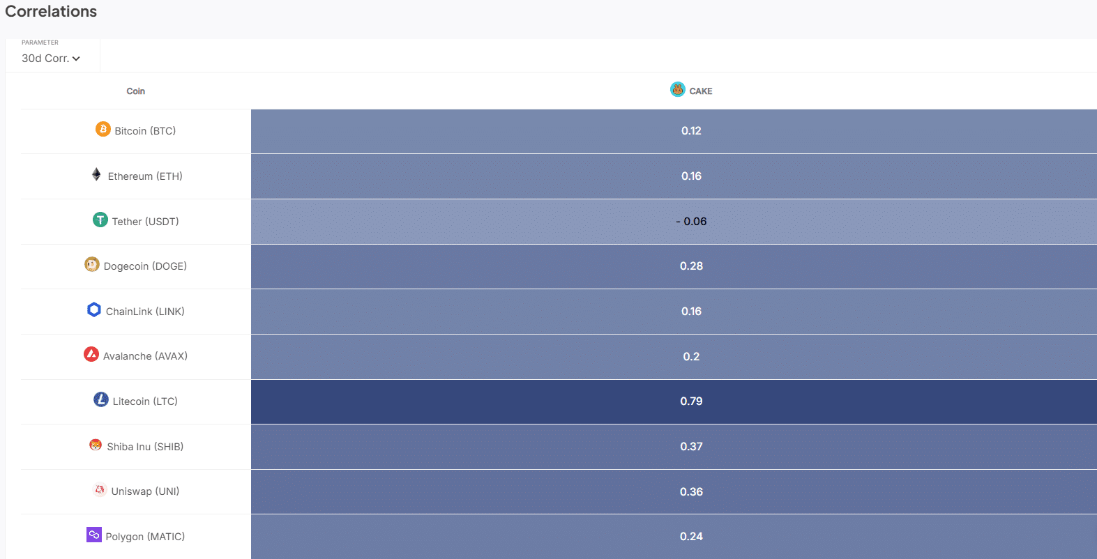 The correlations chart revealed that CAKE had a near zero correlation with major assets such as Bitcoin and Ethereum [ETH]. Surprisingly, it does have a +0.79 correlation with Litecoin [LTC], an asset that only recently broke out of a two-year range and flipped $110 to support while lacking a long-term trend.