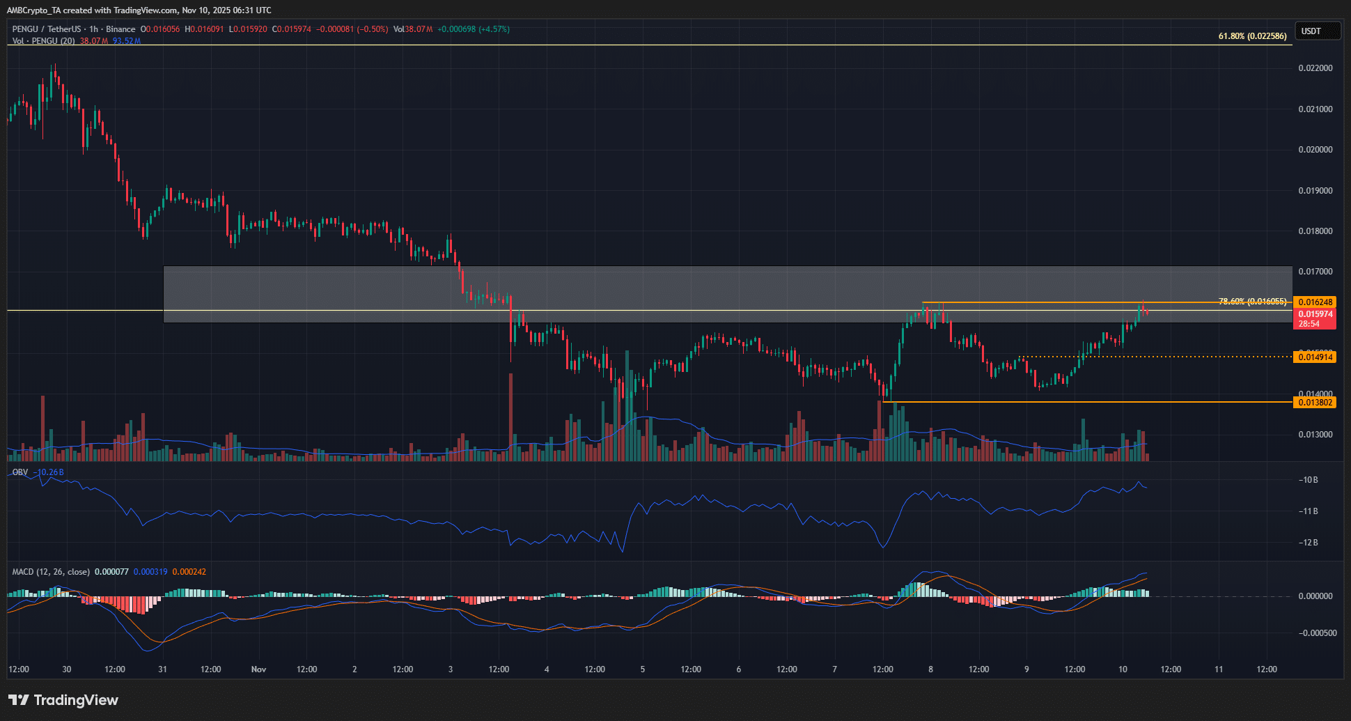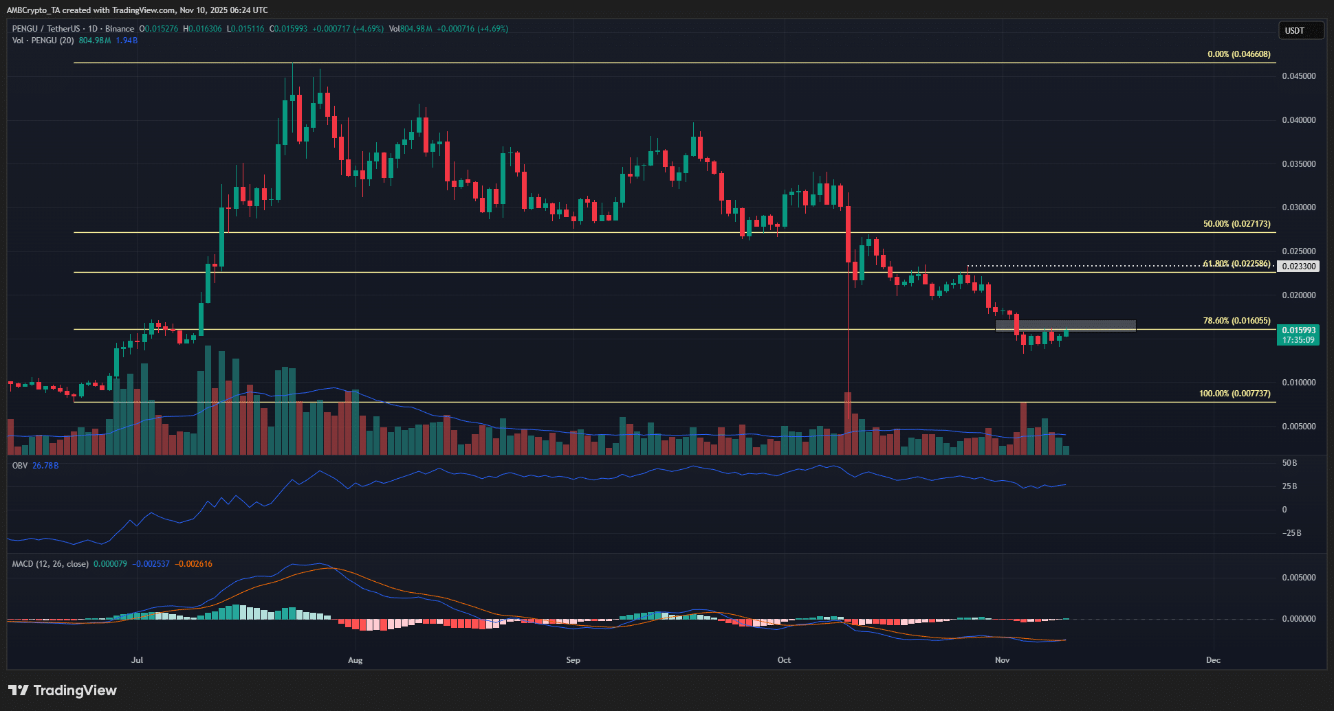 PENGU has dropped by 28.5% from the 27th of October, falling below the 78.6% Fibonacci retracement level at $0.016.