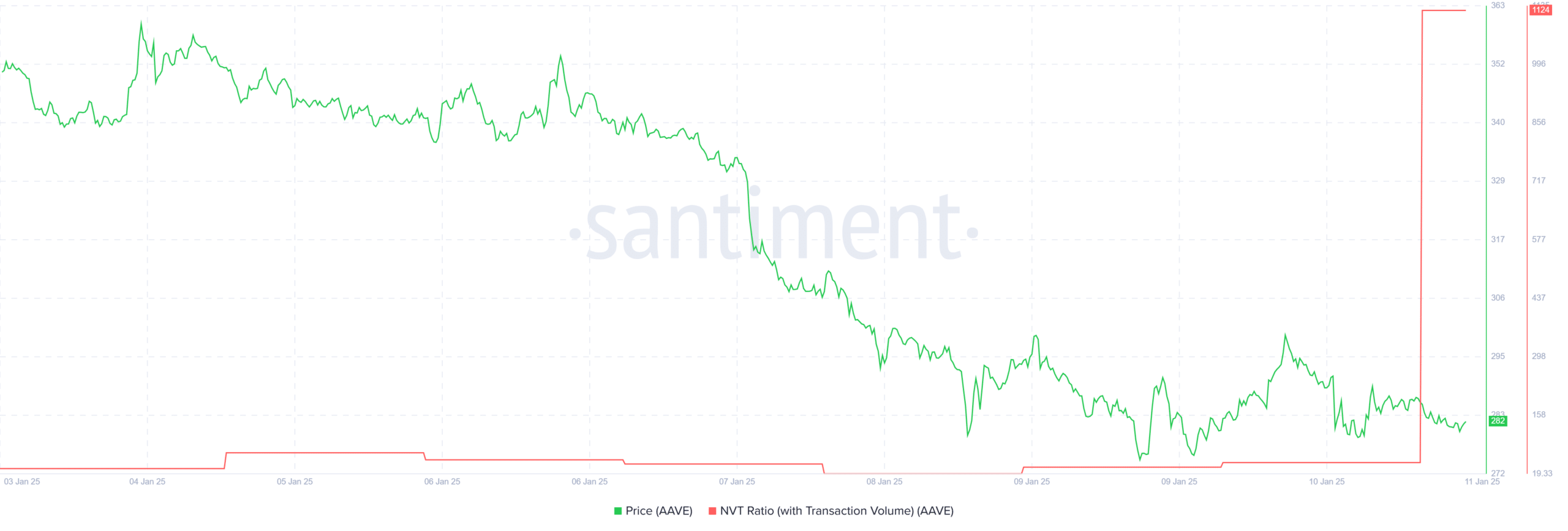 Looking further, AAVE has experienced a strong decline in network activity, as reflected by a surging NVT Ratio. This has spiked to 1124 indicating that the altcoin’s market cap is high relative to transaction activity.