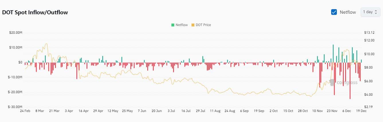 According to Coinglass, DOT saw over $10 million worth of spot outflows in the last 2 days. This seemed to be line with the altcoin’s negative Open Interest and declining price action.