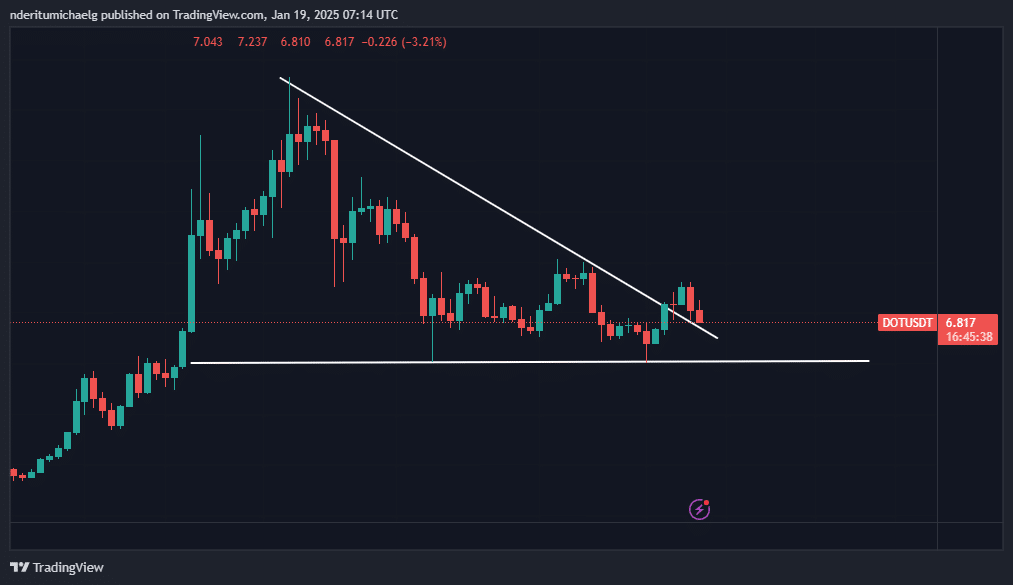 In fact, DOT has been in an overall bearish trend since December. However, it has so far demonstrated support at the $6 price level. Meanwhile, the upper limits of the trend were restricted by a descending resistance line. These support and resistance levels highlight the wedge pattern that DOT has been trading within for the last 7 weeks now.