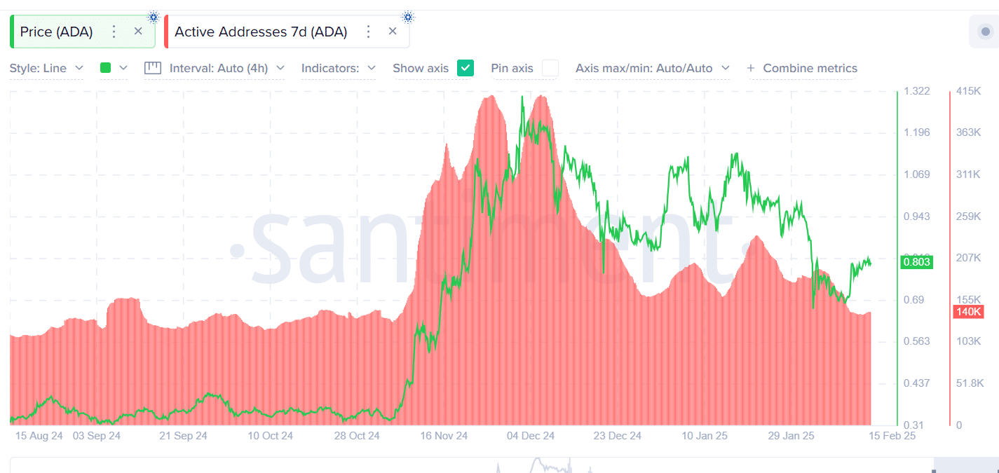 As of this writing, ADA was trading at $0.7990 with its trading volume rising by 3.6% in the last 24 hours and 12% in the previous week, according to CoinMarketCap.