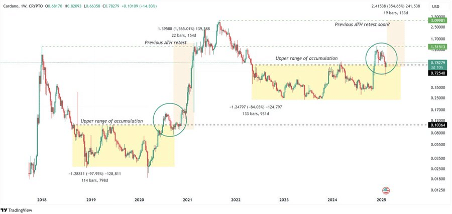 TapTools shared this analysis on X (formerly Twitter), suggesting that the accumulation period of ADA since 2022 was similar to the previous bull run on the weekly chart.