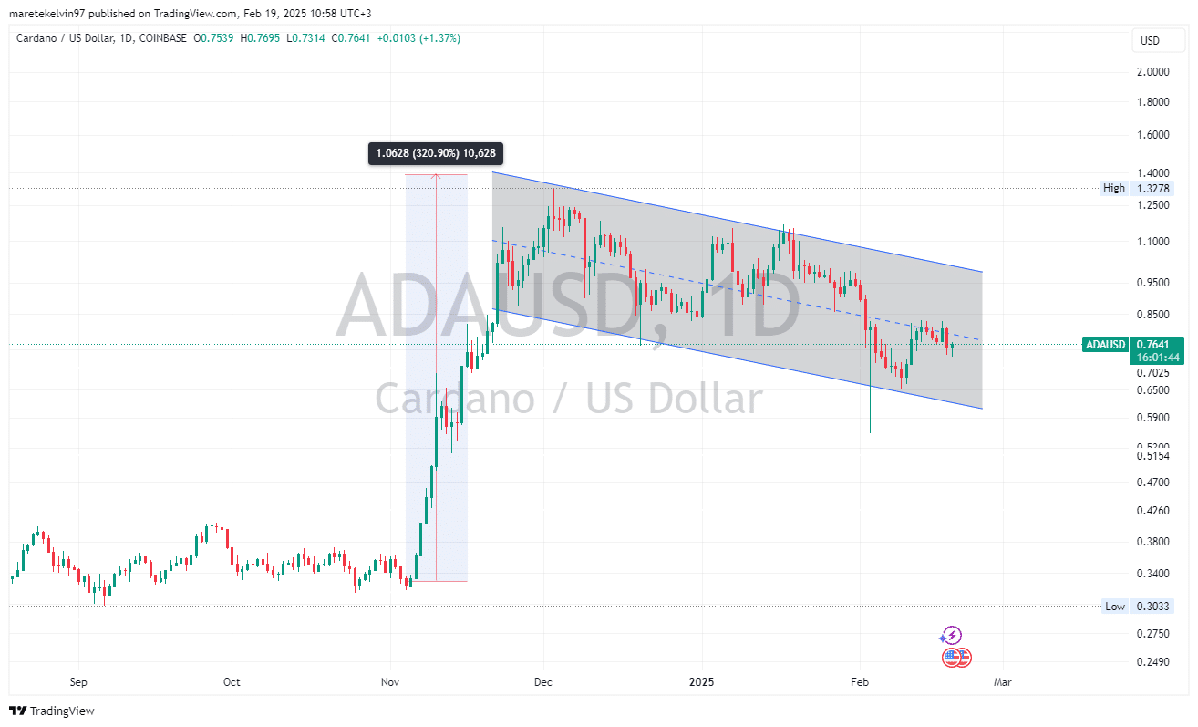 The recent price drop has left ADA in a weak position. As of this writing, Cardano was approaching a critical support level. Technical indicators flashed bearish signals, suggesting that it could dip further to test the flag support.